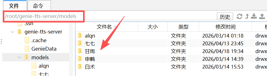 pip install genie-tts接着,在 genie-tts-server 目录下创建一个 models 文件夹,将下载好的模型文件放置到该目录中。